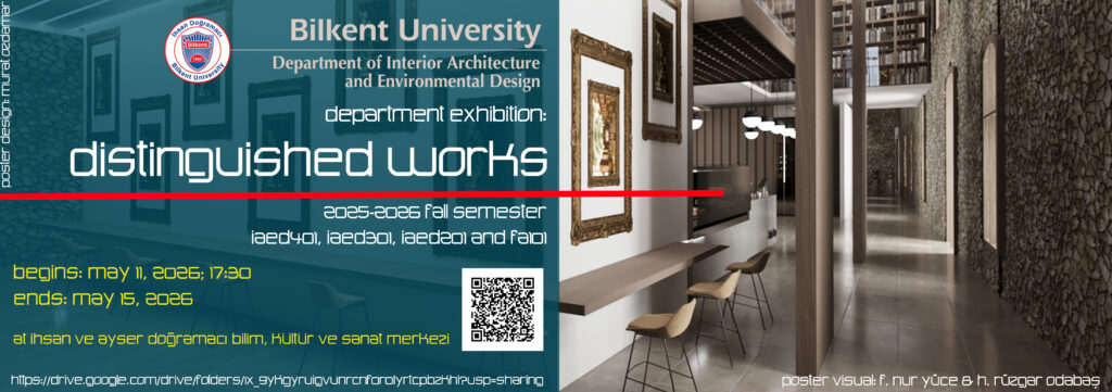 The department exhibition of works made in the 2025-2026 Fall semester design studios (IAED401, IAED301, IAED201, FA101), “Distinguished Works,” will reopen on Monday, May 11, 2026, at 17:30 in tİhsan ve Ayser Doğramacı Bilim, Kültür ve Sanat Merkezi. Students and staff of IAED and all Bilkenters are welcome!