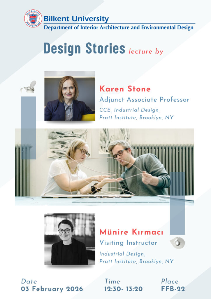 The lecture titled “Design Stories” will be held on Tuesday, February 03, 2026, at 12:30, in FFB-22, which will be given by Karen Stone, adjunct associate professor from Pratt Institute, and Münire Kırmacı, visiting instructor from Pratt Institute. All students and staff are welcome.