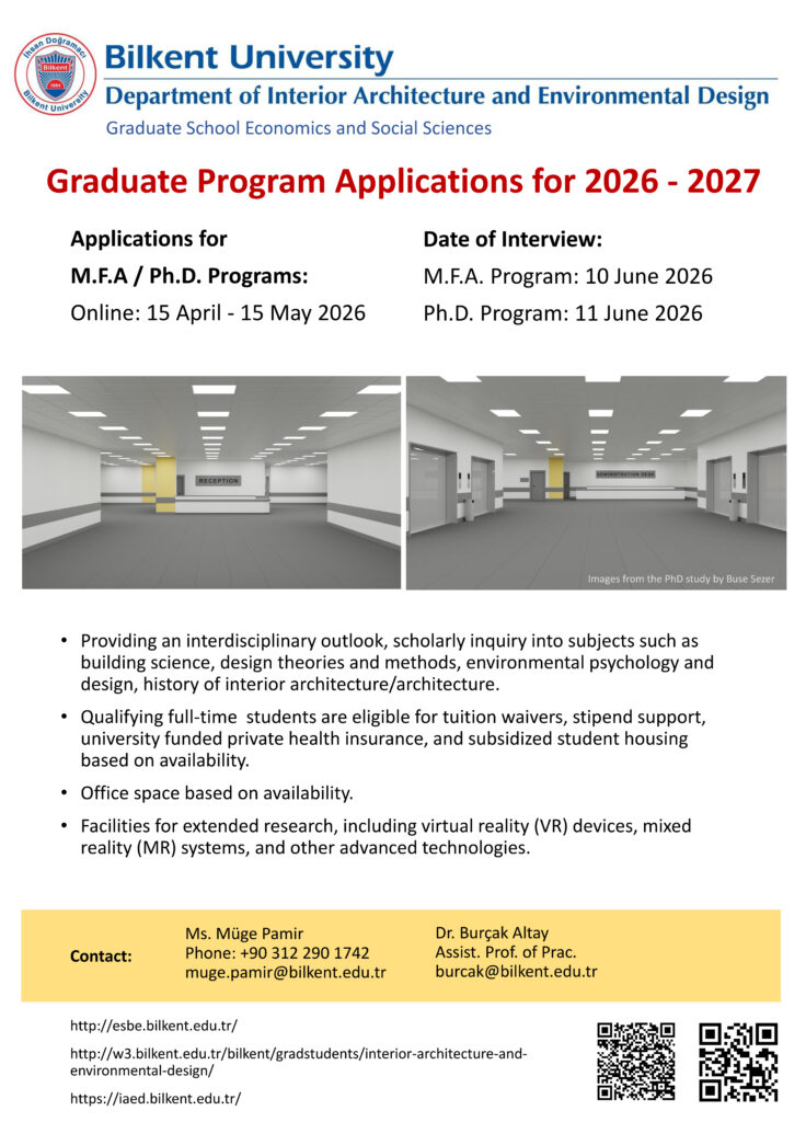 Bilkent Üniversitesi İç Mimarlık ve Çevre Tasarımı Bölümü lisansüstü programları (M.F.A. ve Doktora) için 2026–2027 Akademik Yılı başvuru dönemi 15 Nisan–15 Mayıs 2026 tarihleri arasında açıktır.